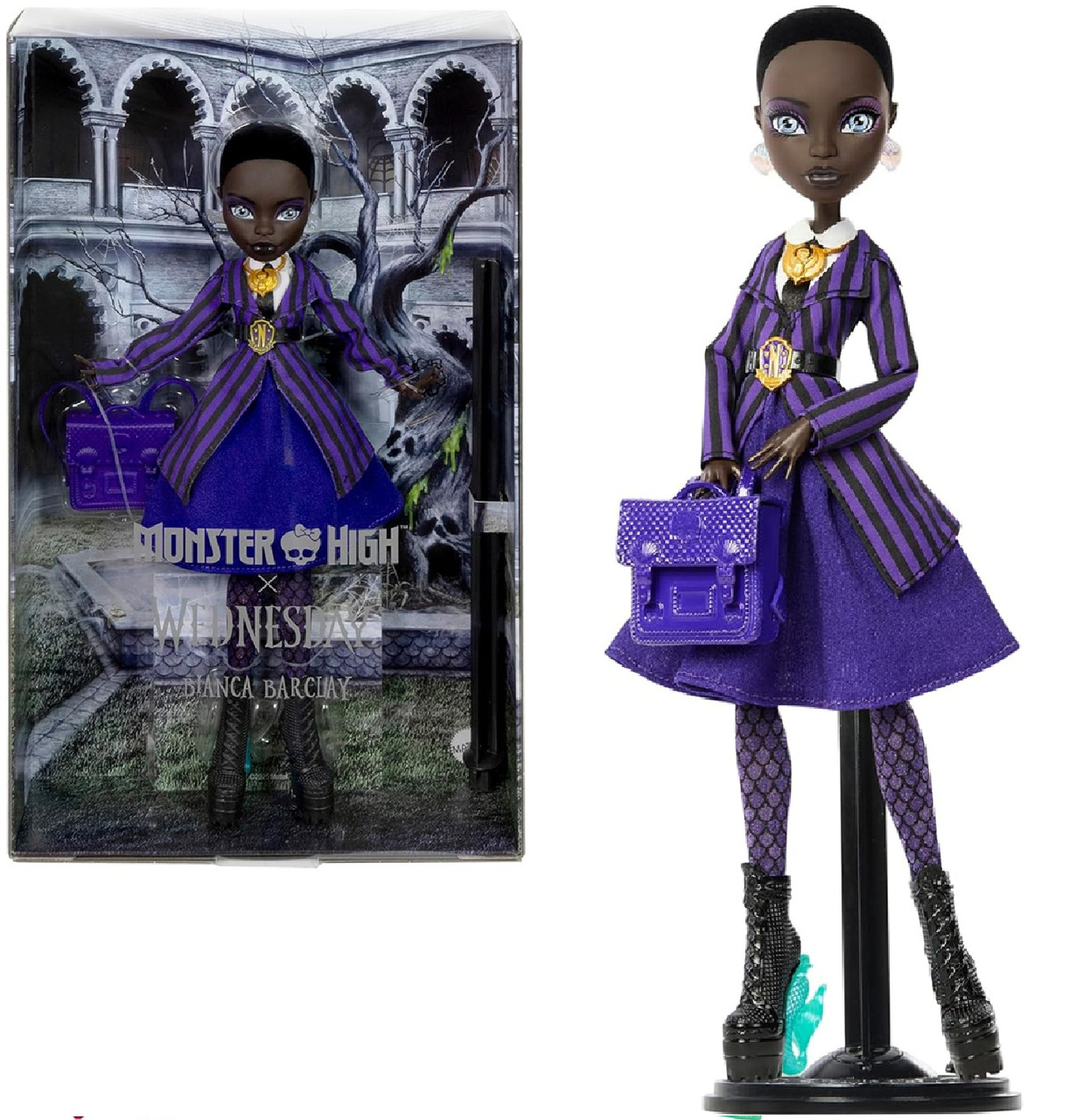 Лялька одягнена у фіолетову форму академії Nevermore, яка доповнена ефектними деталями: райдужними сережками-черепашками, золотим амулетом сирени та поясом із гербом школи. Лускаті колготи й стильний рюкзак-сумка підкреслюють морську тематику образу, а платформи з деталями, натхненними серіалом, роблять ляльку ще більш автентичною та впізнаваною для фанатів.