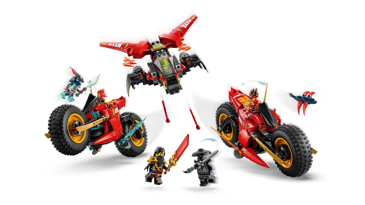 Велика бойова машина NINJAGO®, яку можна трансформувати на 3 транспортні засоби: мотоцикл Кая, мотоцикл Вайлдфайра та реактивний літак Фрака з 2 шиповими шутерами