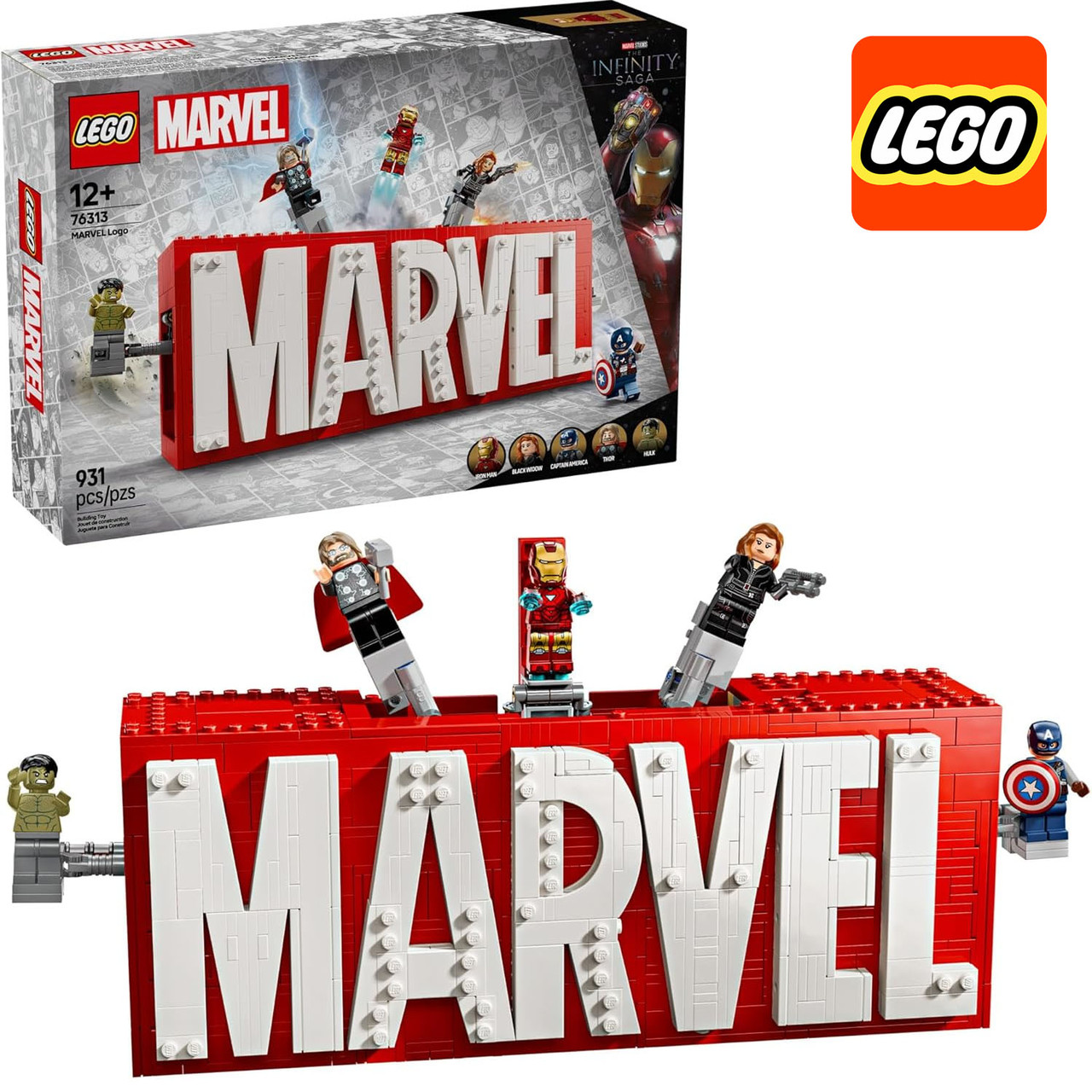 Набір «Логотип і мініфігурки MARVEL» (76313) LEGO® Marvel — це унікальна колекційна модель, яка сподобається шанувальникам супергероїв і дітям від 12 років. У ньому зібрані п’ять мініфігурок відомих Месників, включно з Халка, Тора, Залізної людини, Чорною вдовою та Капітаном Америку.